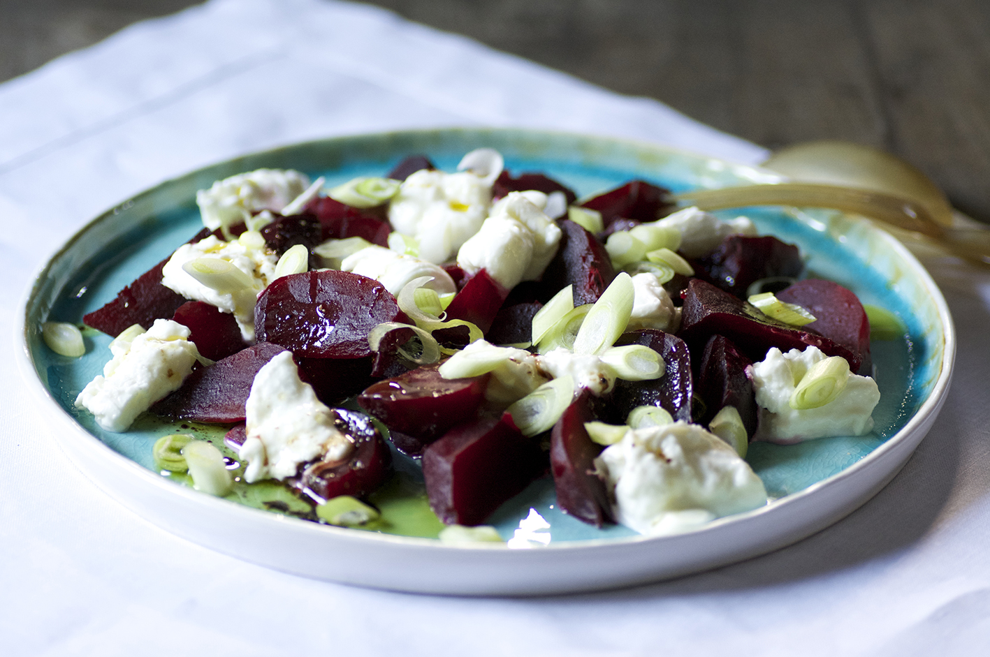 Kook eventueel rauwe bieten 30 minuten in de snelkookpan of 1-2 uur in een gewone pan en laat ze afkoelen. Maak de bosuitjes schoon en snijd ze in schuine stukjes. Klop een dressing van de olie, de balsamicoazijn en peper en zout naar smaak.