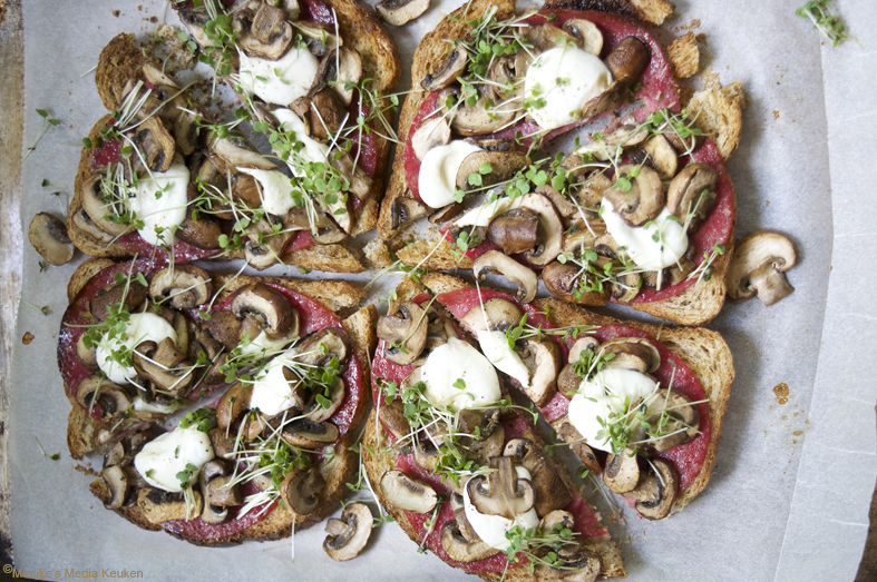 Broodpizza met salami, champignons en rucolakers