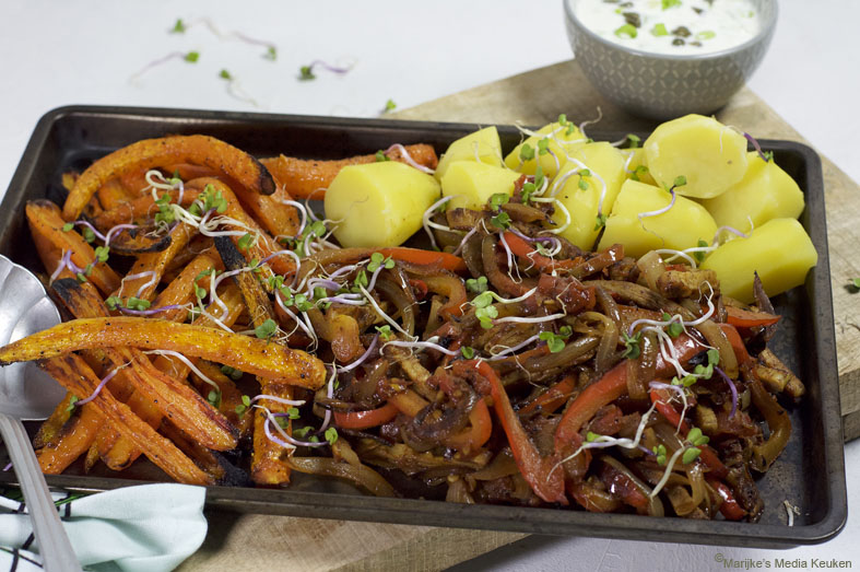 Voor deze vegetarische kipshoarma met geroosterde bospeen heb ik de kipshoarma van De Vegetarische Slager gebruikt. Deze keer geen shoarma op een pitabroodje maar gebakken met paprika en uien geserveerd met geroosterde bospeen en aardappelen. Met een beetje srirachasaus wordt het een lekker pittig gerecht. Hoofdgerecht voor 2-3 personen 1 bos bospeen, geschild olijfolie 3 [...]