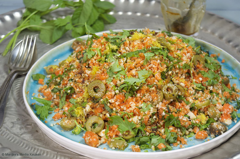 admin2019-04-25T17:10:12+01:00Deze wortel-bloemkoolcouscous met olijven maakte ik omdat ik niet voldoende bloemkool in huis had om een bloemkoolcouscous te maken. De bos peen die er nog lag bracht uitkomst! De bloemkoolcouscous zag er door de wortel kleuriger uit en viel in goede smaak bij mijn mede tafelgenoten. Dit is dus wat ons betreft een blijvertje. Geen [...]
