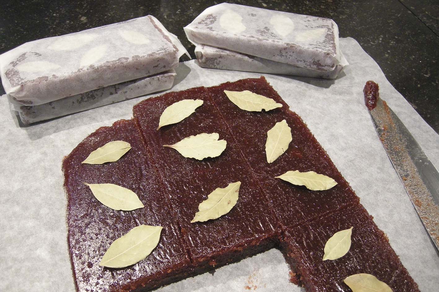 Verdeel de membrillo over een met bak- of vetvrij papier beklede schaal en strijk hem uit. Laat de dulce de membrillo helemaal afkoelen en opstijven. Snijd hem in 8-10 stukken, leg er laurierblaadjes op en verpak de stukken in bak- of vetvrij papier. Bind de pakketjes dicht met bindtouw en bewaar ze in een goed afsluitbare trommel of doos. De dulce de membrillo blijft wel een jaar goed. Geef de membrillo in dunnen plakjes gesneden bij kaas.