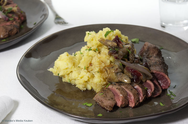 Dit recept van hazenrugfilet met pastinaakstamppot maakte ik verleden weekend van een vers geschoten haas. De bouten gingen de vriezer en de hazenruggen serveerde ik met een lekker stamppotje. Met een jager een paar boerderijen verderop krijg ik regelmatig een telefoontje of ik belang heb bij een haas of gans. Daar zeg ik geen nee tegen. Als kind opgegroeid in de buurt van de Albert Cuypmarkt in Amsterdam aten wij regelmatig wild thuis. Ik zie ze nog hangen de konijnen en hazen aan de karren met hun sokken nog aan. Tegenwoordig is het aanbod van wild op markten zeer beperkt. Ik denk zelfs dat op het platteland makkelijker aan wild te komen is dan in de grote stad. Jammer want zo’n haas is een prachtig stukje scharrelvlees!