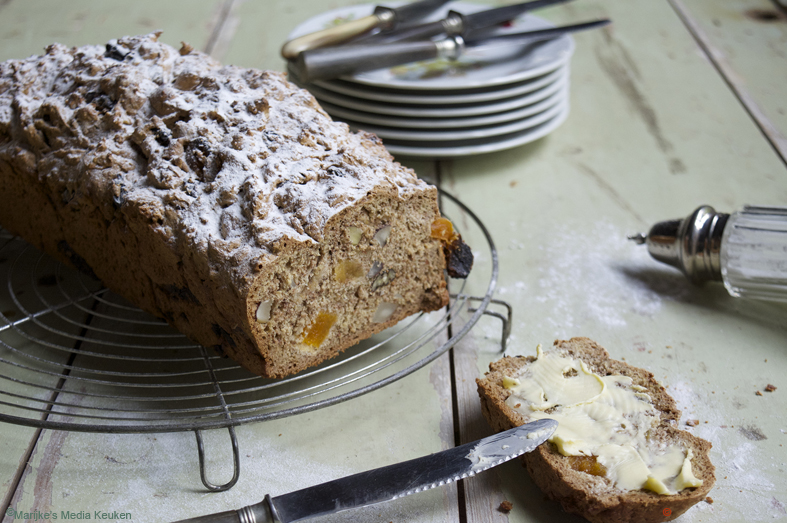 Dit noten-vruchtenbrood zonder gist is een leuk brood om in het weekend te bakken. Omdat je in plaats van gist bakingsoda en karnemelk gebruikt hoeft het deeg niet te rijzen. Dat scheel enorm in de bereidingstijd. Ik schreef het recept ooit voor de Jumbo en heb het brood al ontelbare malen gebakken. Gewoon omdat het zo lekker is maar ook omdat het veel sneller klaar is dan brood met gist of zuurdesem. Dit stevige brood vol noten en gedroogde vruchten smaakt lekker met een lik boter maar ook met een plak belegen kaas is het een echte traktatie!