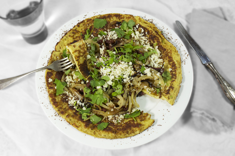 Verdeel het uienmengsel en de kaas over de pannenkoeken en bestrooi met sumak naar smaak en het korianderblad. Lekker met een komkommersalade met knoflook en peterselie (zie tip).