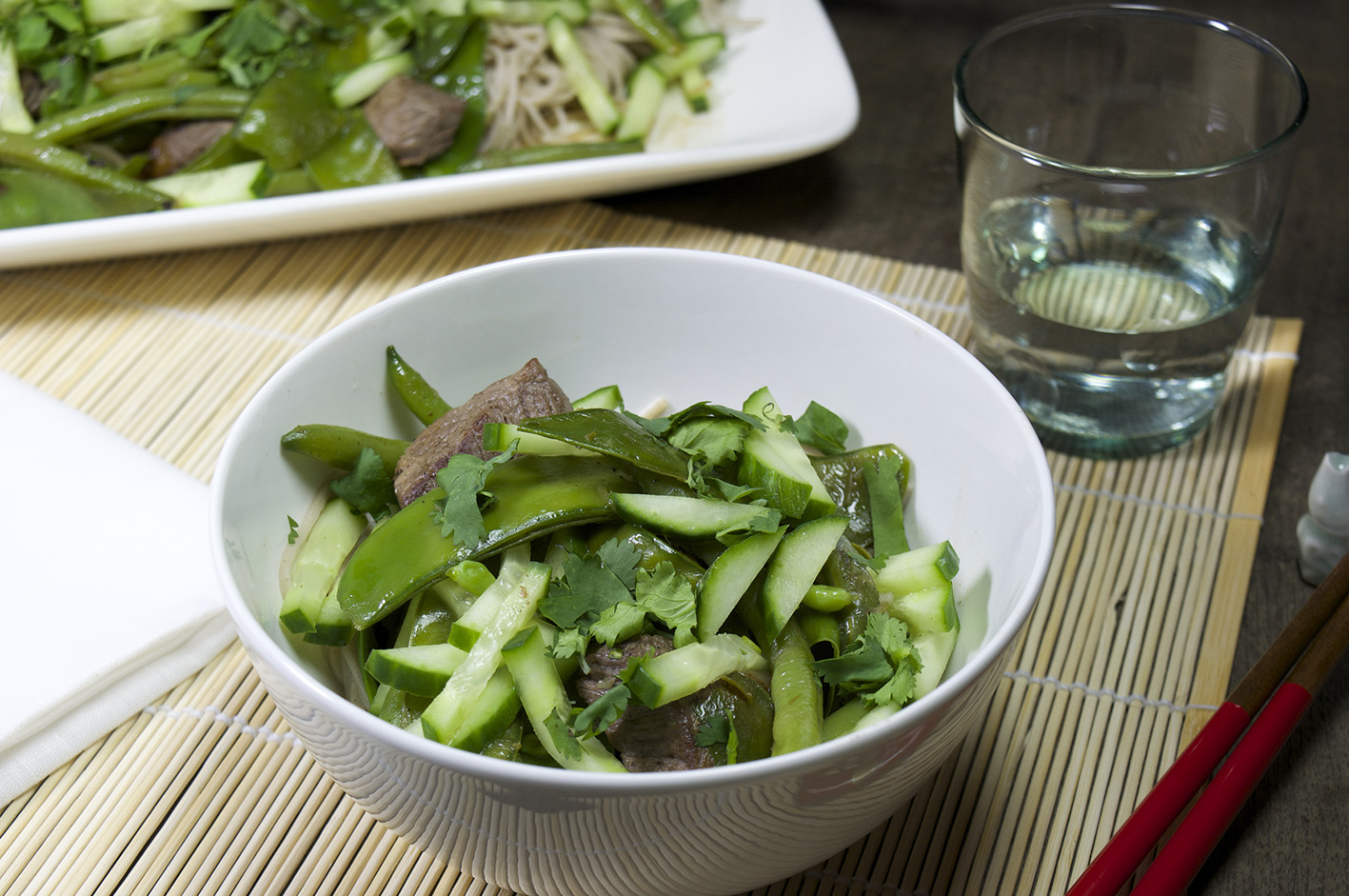 Kook de soba volgens de aanwijzingen op de verpakking. Verhit gelijktijdig de rest van de olie en bak de sperziebonen met de peulen, de koriandersteeltjes en de rest van de gember 2-3 minuten al omscheppend op een hoog vuur. Voeg de biefstukpuntjes toe en bak kort op een hoog vuur mee.