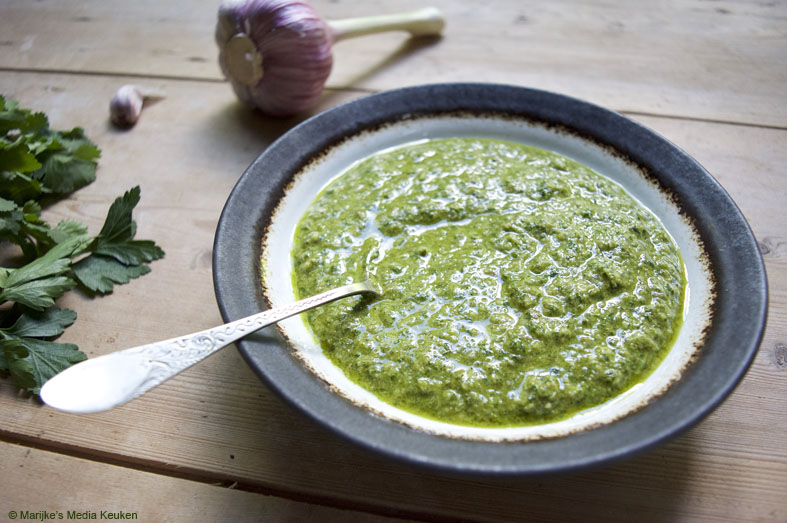 Salsa verde of groene saus is een saus op basis van groene kruiden. Di is een van mijn favoriete smaakmakers. De saus is bij uitstek geschikt om te serveren bij geroosterd vlees maar ook bij vis of gevogelte serveer ik regelmatig een salsa verde. Laatst nog bij snoekbaars uit de oven. Gisteravond aten wij deze lekkere kruidige saus bij de asperges. Klassiek met ham, ei en nieuwe aardappeltjes maar dan in plaats van de boter een salsa verder erbij. Daar lik je echt je vingers bij af. Maar ook als dressing door salades, en als dip met knapperige groenten, als voorafje of gewoon een lik op een geroosterde stuk brood. Salsa verde, ik wordt er blij van!