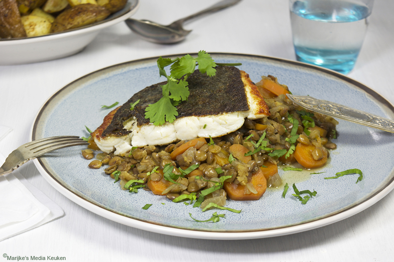 Bij het Nederlands Visbureau is schol de vis van de maand september en dat komt goed uit want ik heb voor vandaag een recept van schol met linzen en bospeen op het menu staan. Schol is een smakelijke en met z’n mooie oranje stippen een van de meest makkelijk herkenbare platvissen. Ik bereid schol bij voorkeur in z’n geheel maar heb je geen zin in graatjes dan neem je, zoals in dit scholrecept, scholfilet. Vraag wel of de visboer de huid erop laat zitten dan blijft de vis lekker mals en droogt hij minder snel uit tijdens het bereiden.