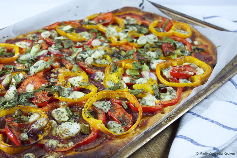 Zo af en toe eten we een pizza, wel een zelfgemaakte natuurlijk, zoals deze snelle pizza met salami en paprika. Wat ik erop leg ligt aan wat ik op dat moment in huis heb. De ene keer is het salami en paprika, een andere keer kaas met uien en paddenstoelen. Ik had nog een blikje koelvers brooddeeg van een productie over, daar kon ik prima een pizzabodem van rollen!