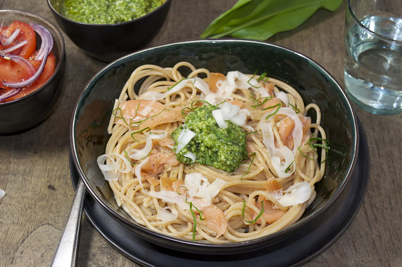 Zoals ik heb beloofd een recept met de daslookpesto. Deze spaghetti met zalm en daslookpesto staat werkelijk zo op tafel. In de tijd dat de pasta kookte maakte ik er een lekkere frisse tomatensalade met rode ui bij.