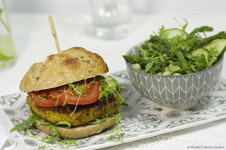 Deze vegetarische burger van tofu en witte bonen was een experiment. Ik had wat tofu over en was benieuwd of ik er zonder ei en een bindmiddel in de vorm van broodkruim, paneermeel of havermout ook een burger van kon maken. Ik kon het mengsel goed vormen en de tofuburger behield, mits gekeerd met een brede spatel, goed zijn vorm.